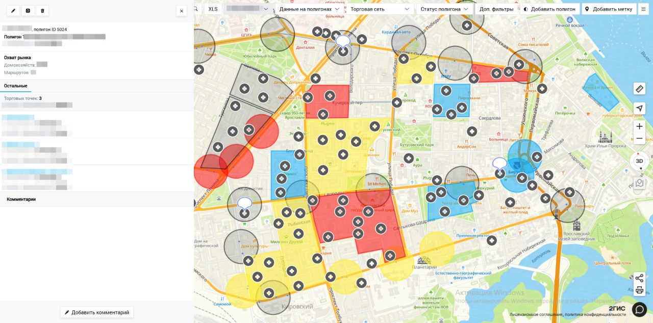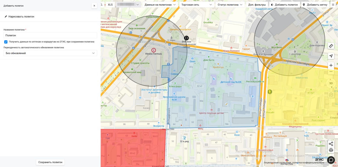 Система позволяет строить зоны анализа — автоматически вокруг остановок или вручную, как произвольные полигоны. Для каждой зоны мгновенно собираются данные: количество домохозяйств, расположение конкурентов, транспортная доступность.