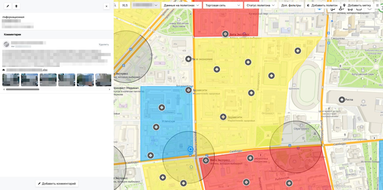 Аналитик настраивает правила: «Если в зоне >500 домохозяйств и доля наших торговых точек <20% — пометить как “Для экспансии”». Система автоматически пересчитывает условия и визуально выделяет зоны на карте одним из цветов: зелёным, жёлтым или красным — без ручного пересчёта.